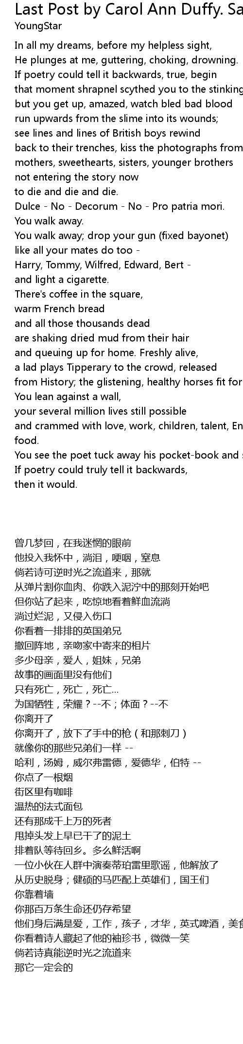 We are delighted to feature 'last post' in this episode and would like to thank carol ann duffy and peter strauss at rogers, coleridge & white. You can display text in a blockquote by placing it inside <blockquote> and </blockquote> tags in your text editor, or by clicking. Last post is a poem written by carol ann duffy, the poet laureate of the united kingdom, in 2009. The poem, named after the last post (the bugle call used at british ceremonies remembering those. We have been publishing popular contemporary poetry online since 2006.